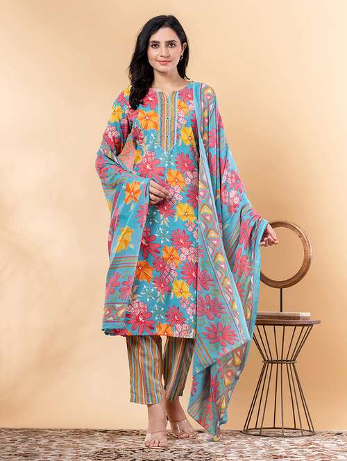 • Find gorgeous sets of ethnic wears in trending designs in turquoise colors suitable for festive wear of occasions.