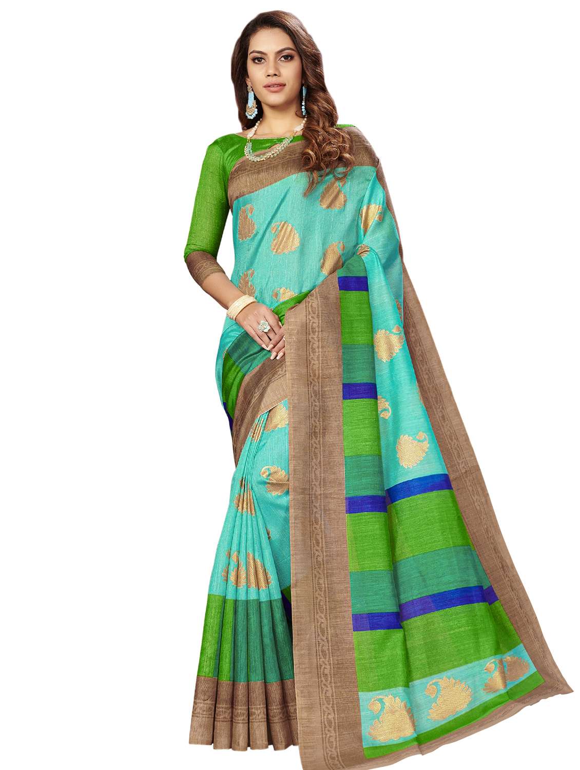 - » turquoise cotton silk printed saree with blouse
