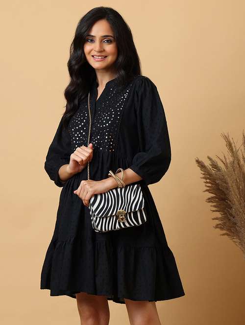 Upgrade your wardrobe with this women’s cotton embroidered A-line mini dress, designed for style, comfort, and versatility. Crafted with soft cotton-rich fabric, this dress ensures breathability and a relaxed fit, making it a perfect choice for both everyday wear and special occasions. The embroidered yoke with button details adds a touch of elegance, while the tiered flare design enhances your silhouette and gives a chic, flowy look. With its 3/4 sleeves and knee-length cut, this dress is suitable for all seasons – pair it with ankle boots for a trendy look, or style it with heels for a party-ready outfit. Whether you’re heading to brunch with friends, casual office day, or a festive gathering, this dress blends comfort with sophistication. Available in two classic shades – White & Black, this versatile piece will be your go-to outfit for multiple occasions. Make a stylish statement with this embroidered mini dress – a must-have addition to every modern woman’s collection.