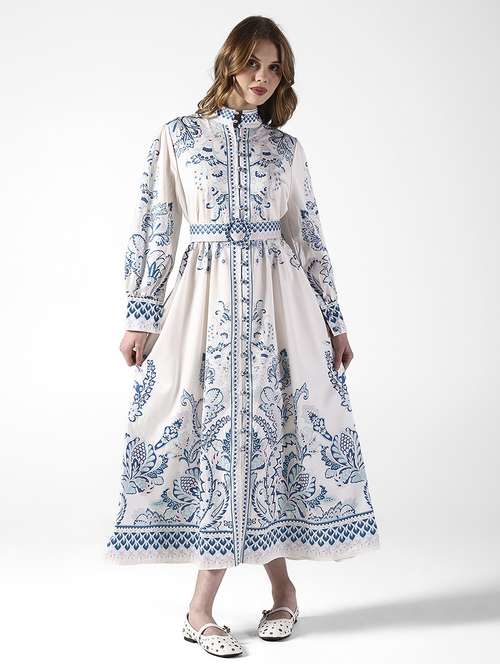 SHOWOFFFF Edition Women's Floral White & Blue Maxi Dress with Belted Waist