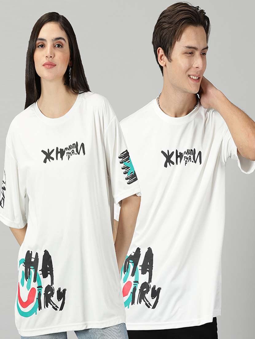 white cotton blend printed couple t-shirt