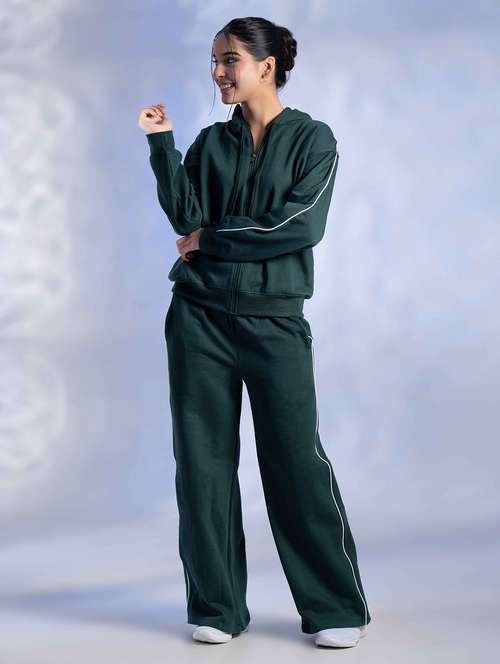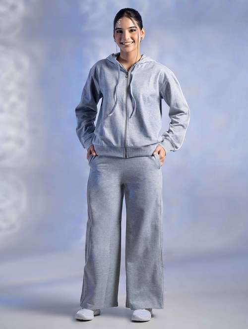 Stay warm, stylish, and effortlessly comfortable with this Cotton Woolen knitted zip-up hoodie co-ord set. The top features a full front zipper, adjustable hood with drawstrings, and a relaxed sweatshirt-style fit—perfect for layering or wearing on its own. Paired with wide-leg pants featuring an elastic waistband and sleek contrast side piping, this set blends sporty aesthetics with cozy everyday comfort. Crafted from soft knitted fabric, it offers warmth, breathability, and ease of movement, making it ideal for travel, workouts, lounging, or casual outings.