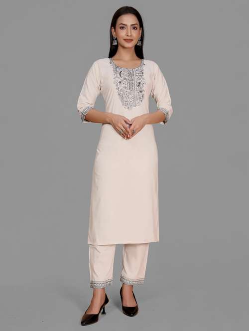 - Find gorgeous sets of ethnic wears in trending designs in off white colors suitable for festive wear of occasions.