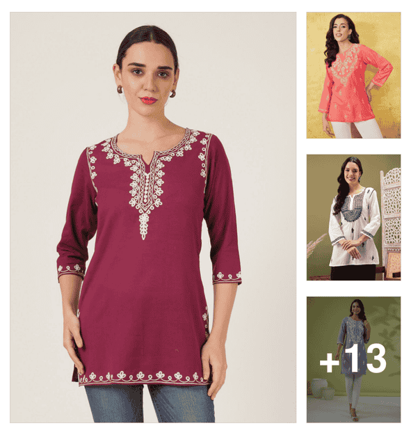 women embroidered three quarter sleeve short kurti