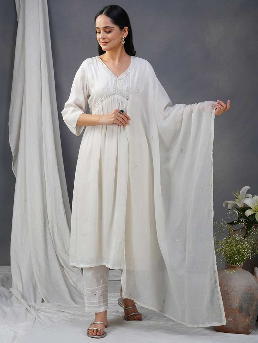 - Find gorgeous sets of ethnic wears in trending designs in white colors suitable for casual wear of occasions.