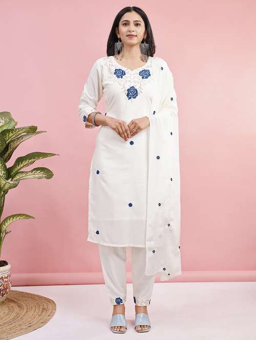 - Find gorgeous sets of ethnic wears in trending designs in white colors suitable for casual wear of occasions.
