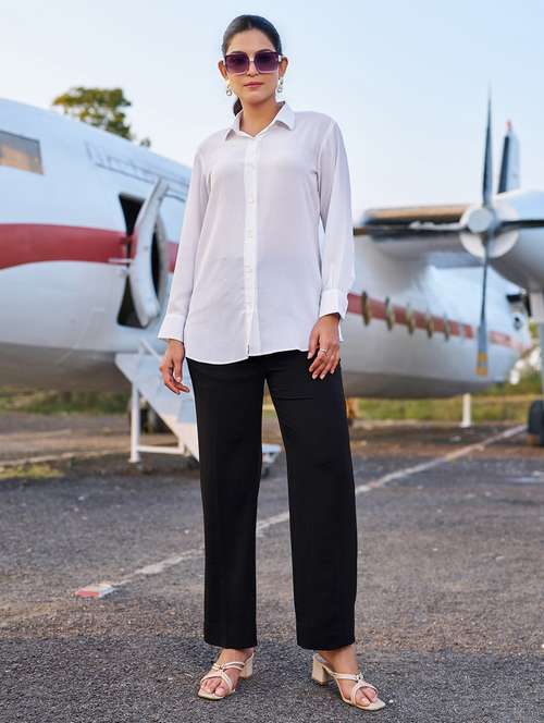 - » women solid long sleeve shirt & trouser co-ord set