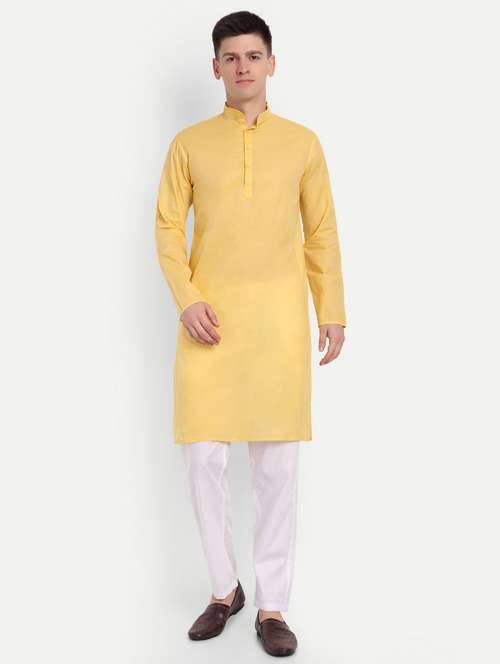 Men's Yellow Mandarin Collar Kurta with White Cotton Pant – Traditional Festive