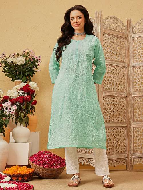 - Grab this beautiful kurta made up of cotton blend fabric featuring round neck designs.