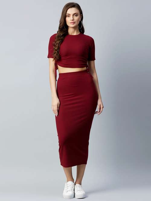 Tee short sleeve, round neck, side drawstrings and long Skirt with an elastic waistband.