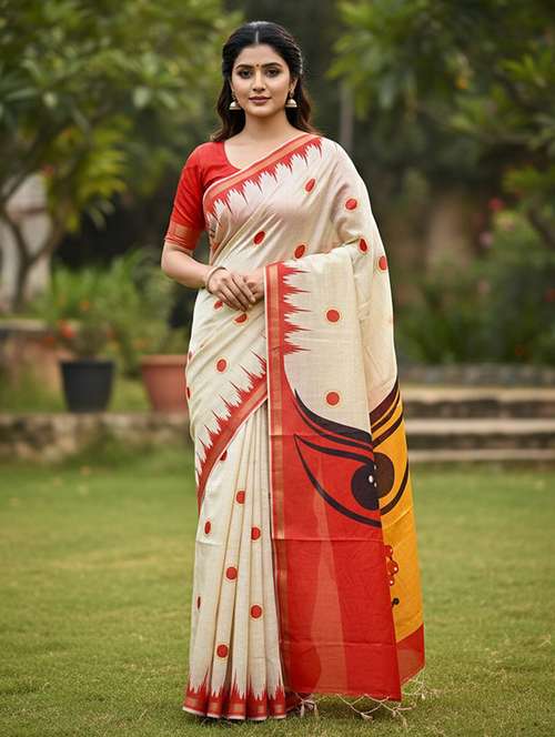 This off-white and red digital printed saree, featuring a magnificent artistic depiction of Goddess Durga on the pallu. Designed with sacred motifs and highlighted with a bold contrast red border, this saree is a true reflection of divine elegance and festive grandeur. Crafted from a soft mul cotton blend, it drapes effortlessly and offers all-day comfort, making it perfect for festive occasions, Durga Puja, Navratri, temple visits, and cultural gatherings. The saree comes with a matching red blouse piece, allowing you to customize it to suit your personal style