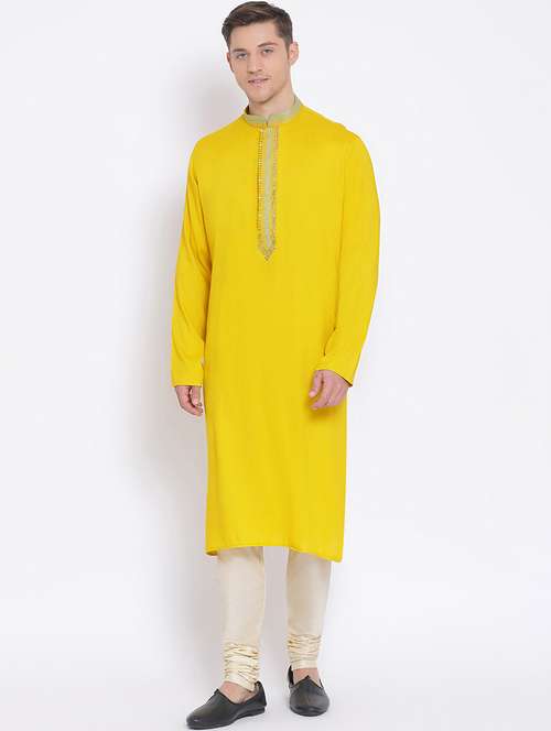 - » yellow solid long kurta with embroidered neckline