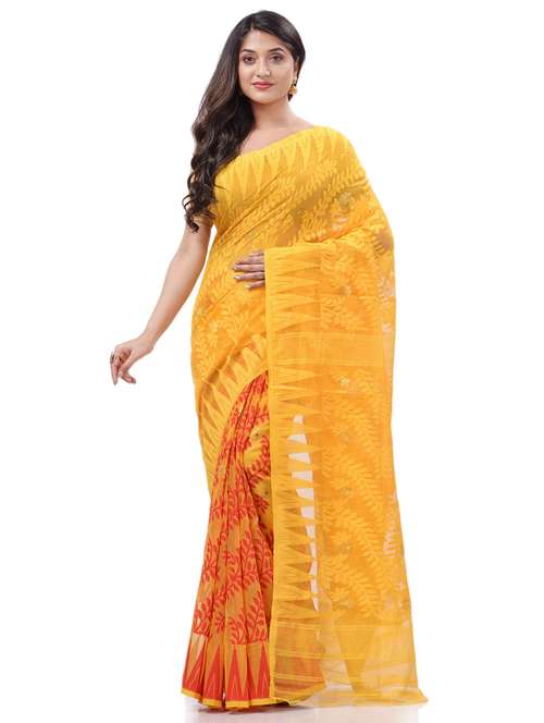 Explore the collection of beautifully Bengal Traditional Tant/Tangail Handloom Hand Made Digital MinaKarat Resham Dhakai jamdani Bengal Pure Cotton Handloom Saree Whole Body Design from Desh Bidesh . Each piece is elegantly crafted and will surely add to your wardrobe. Pair this piece with heels or flats for a graceful look. You can wear this saree in all occasions specially Puja, Party and any occasion in your family or friends. The decorative material is Cotton Threads. Its Uniquie cotton thread design whole body. great looking color combination The Elegant Class saree has comes from the Desh Bidesh. customer satisfaction is the utmost priority . The color may vary due to screen setting . Fabric: Cotton; Length: 5.50 meter Set Content: Without Blouse Piece Care Instructions: Dry Clean Only Wash Care : Dry Wash Only, Don’t Bleach
