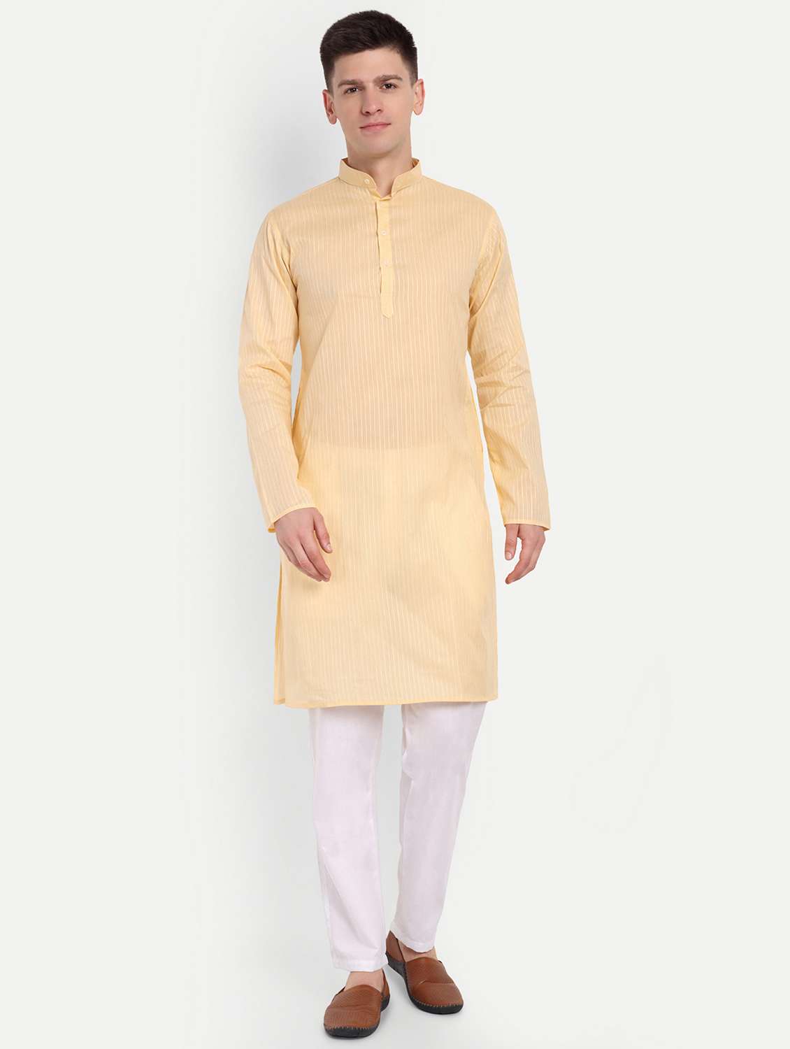 Men's Light Yellow Striped Kurta with Mandarin Collar with White Cotton Pant