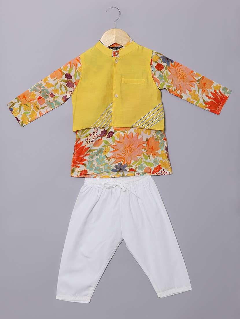 boy yellow floral print kurta set with nehru jacket