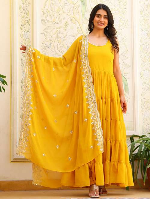 - Find gorgeous sets of ethnic wears in trending designs in yellow colors suitable for festive wear of occasions.