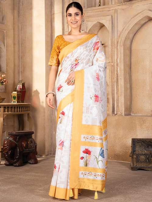 \Bright Yellow Lakhnavi Saree designed with floral digital print and fancy latkans. Lightweight Premium Catalog saree with 5.5 mtr saree and 0.8 mtr blouse. Perfect for casual gatherings, festivals, and daytime functions.\