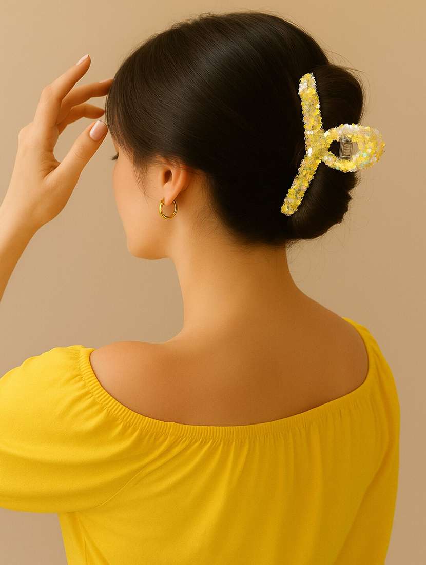 Add a touch of sparkle to your everyday hairstyle with this premium iridescent glitter claw clip. Designed in a trendy T-shape, this claw is crafted from high-quality transparent acrylic and adorned with pastel and holographic star-shaped glitters that shimmer beautifully under light. It’s lightweight yet strong enough to secure medium to long hair, giving a neat and elegant updo. Whether you're heading out for a casual brunch, work, or an evening out, this claw brings both charm and functionality to your look. The side-opening and spring mechanism provide a secure grip without damaging the hair, and its transparent build makes it blend effortlessly with any hair color. Ideal for girls and women who love chic Korean-inspired accessories, this claw is perfect for both festive and daily styling.