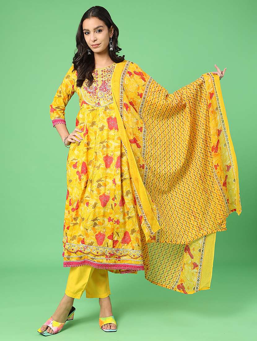 • Find gorgeous sets of ethnic wears in trending designs in yellow colors suitable for casual wear of occasions.