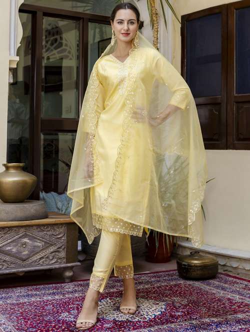 - Find gorgeous sets of ethnic wears in trending designs in yellow colors suitable for festive wear of occasions.