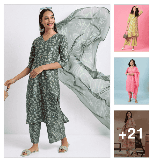 women printed long sleeve kurta palazzo set